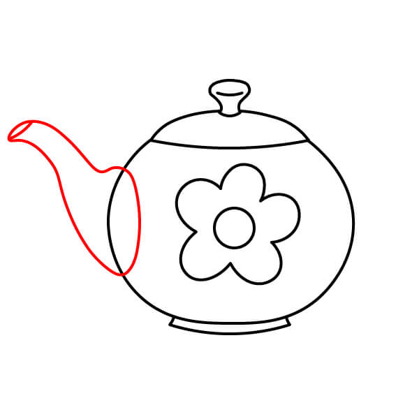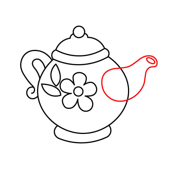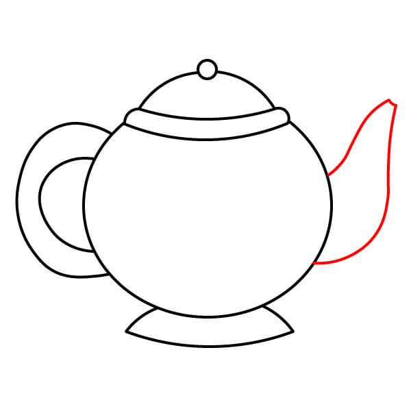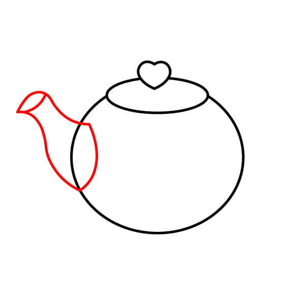 Ở phía bên phải của thân ấm trà, hãy vẽ vòi ấm. Vòi ấm có hình giọt nước cong duyên dáng, thuôn dần về phía cuối với một lỗ nhỏ.