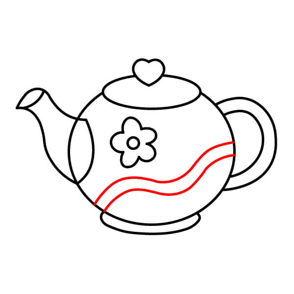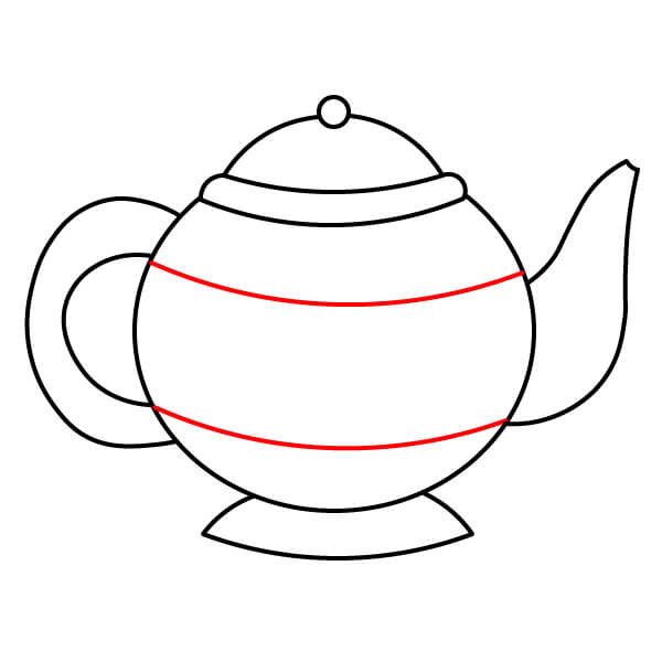 Vẽ hai đường ngang qua giữa thân ấm trà để tạo một đường kẻ sọc ở giữa để trang trí.