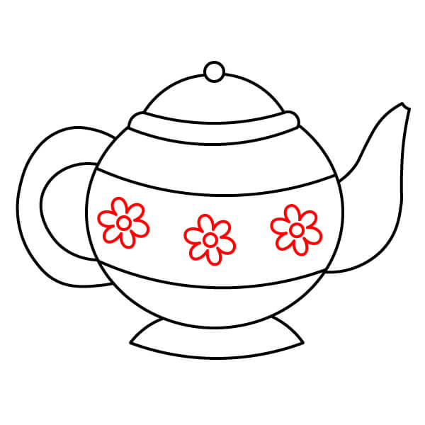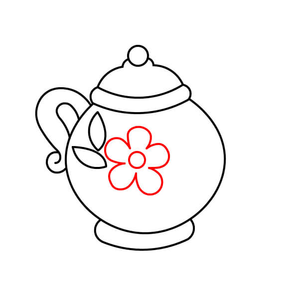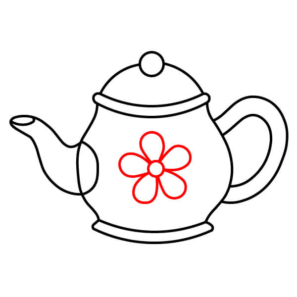 Ở giữa thân ấm trà, vẽ một bông hoa lớn. Bông hoa nên có một hình tròn ở giữa và năm hoặc sáu cánh hoa đơn giản, tròn trịa.