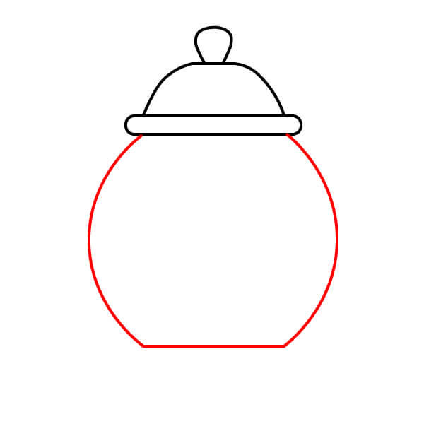 Từ hai đầu của phần đế ấm, vẽ hai đường cong hướng xuống dưới, gặp nhau ở một đường thẳng phẳng hơn, hơi cong ở phía dưới. Điều này tạo ra phần thân chính, tròn trịa của ấm trà.