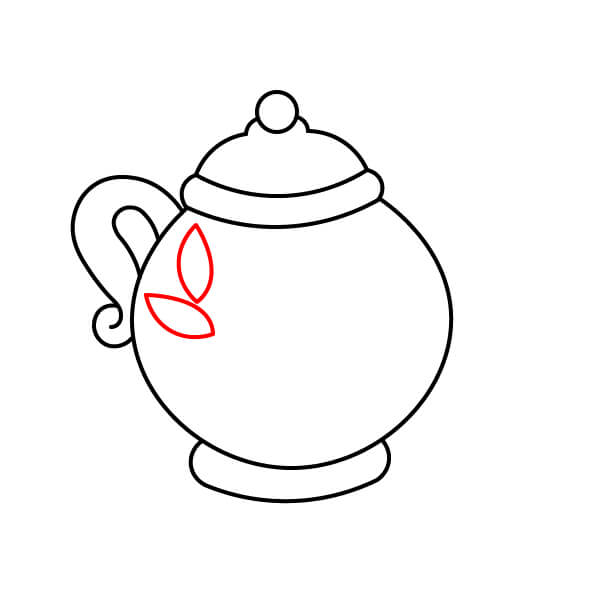 Ở bên cạnh thân ấm trà, gần tay cầm, vẽ hai hình lá nhỏ, cong.