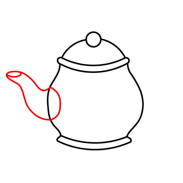 Ở phía bên trái của thân ấm, vẽ vòi ấm. Nó nên có hình dạng ngắn, cong và hơi mở rộng ở phía trên, giống như một đường cong chữ “S” nhỏ.