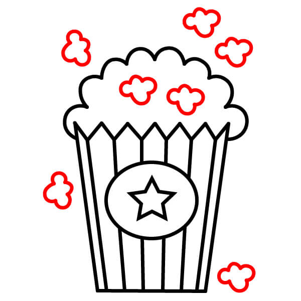 Bên trong hình bỏng ngô lớn, vẽ một vài hình nhỏ, ngoằn ngoèo và không đều để thể hiện những hạt bỏng ngô riêng lẻ.