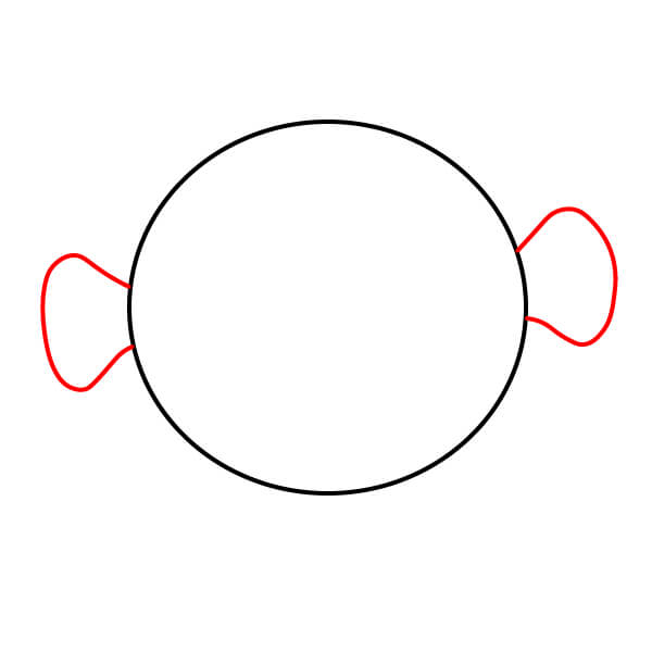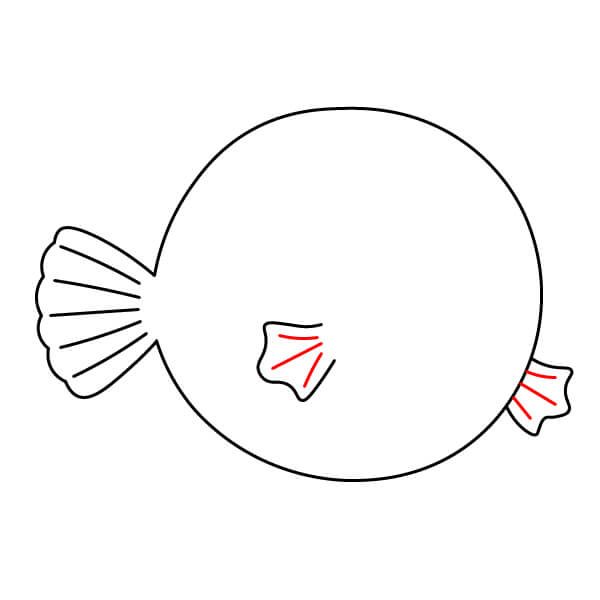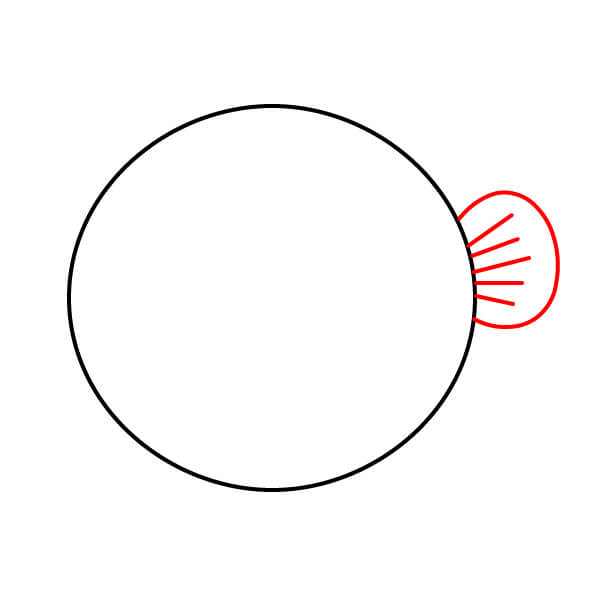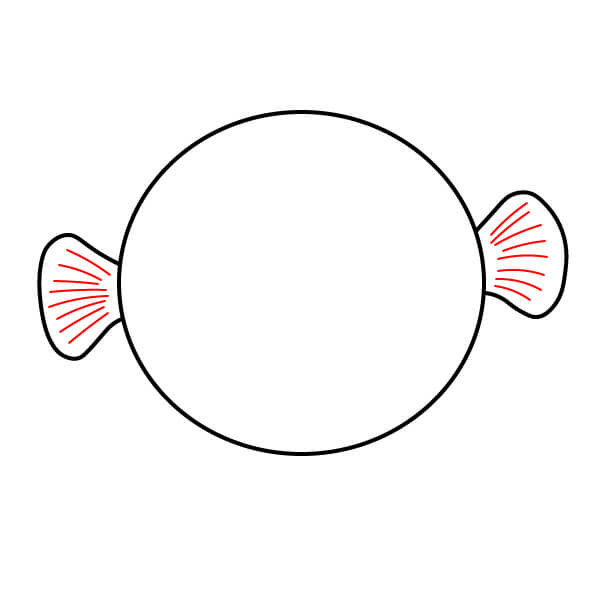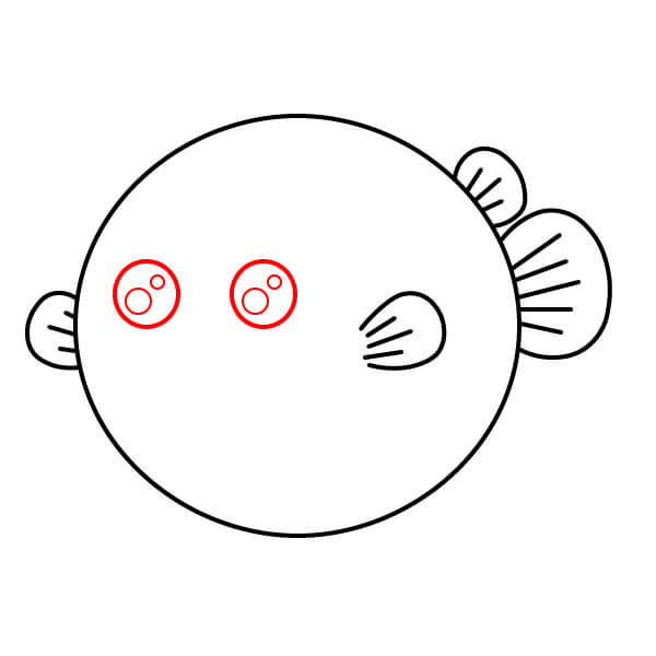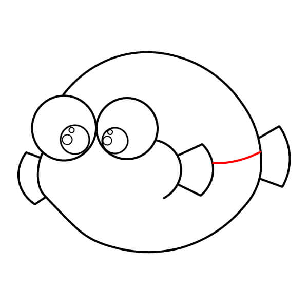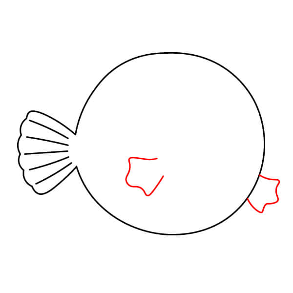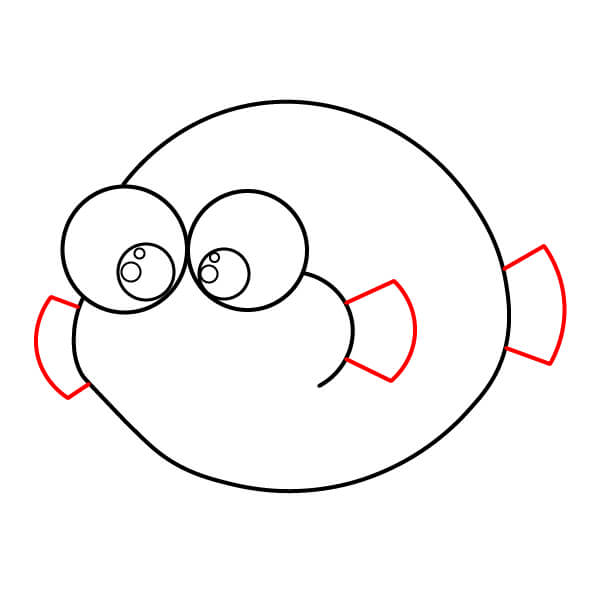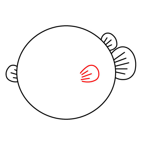 Ở bên trái và bên phải của hình tròn, vẽ hai hình cong giống như tai. Đây sẽ là vây ngực của cá nóc.