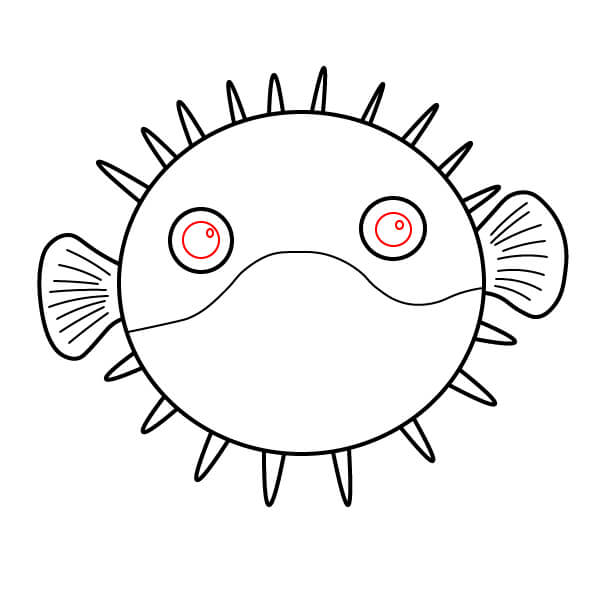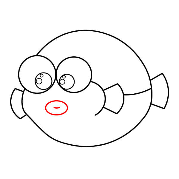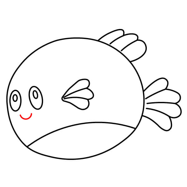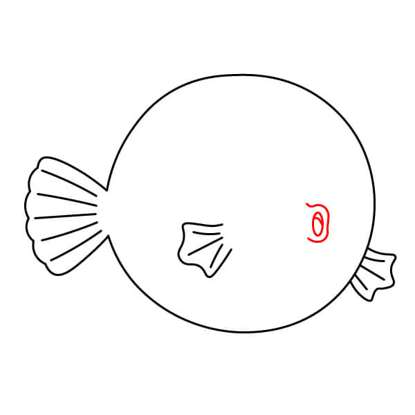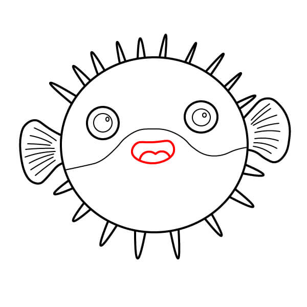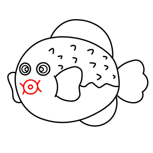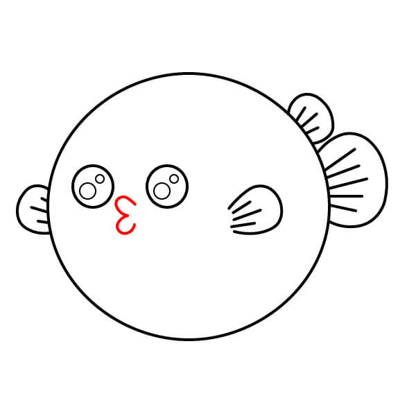 Ở phía bên phải thân cá, vẽ một hình tròn nhỏ bo tròn với một đường lượn sóng bên trong để tạo miệng cá nóc.