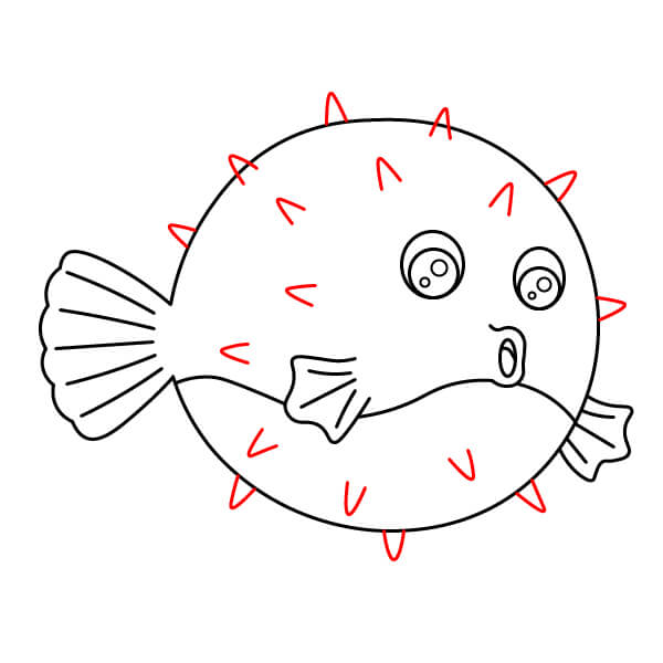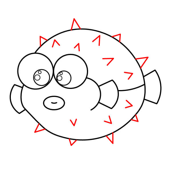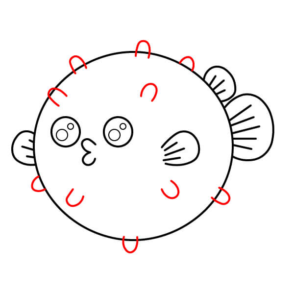 Xung quanh toàn bộ viền của hình tròn, vẽ một loạt các gai nhọn hình tam giác. Đây là các gai phòng vệ của cá nóc.