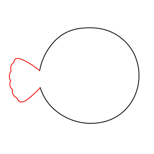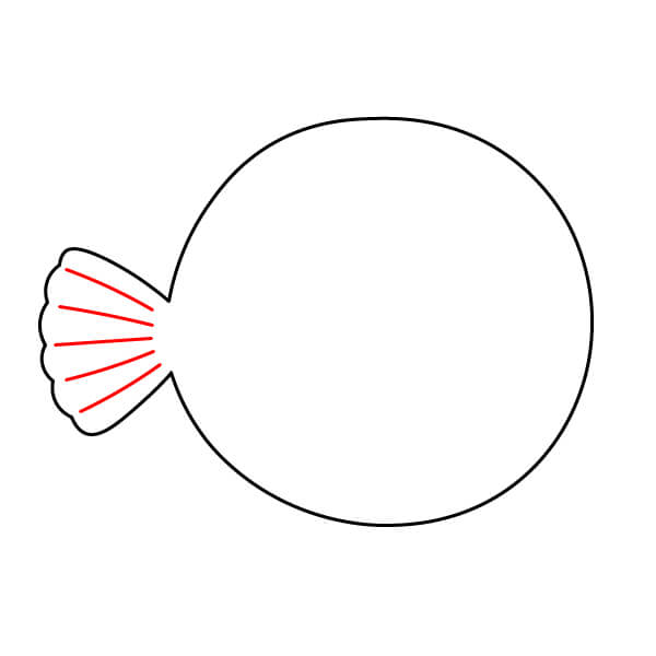 Ở bên phải thân cá, vẽ một hình tròn lớn bo tròn để tạo vây đuôi. Sau đó vẽ các đường ngắn song song bên trong để thể hiện các tia vây.
