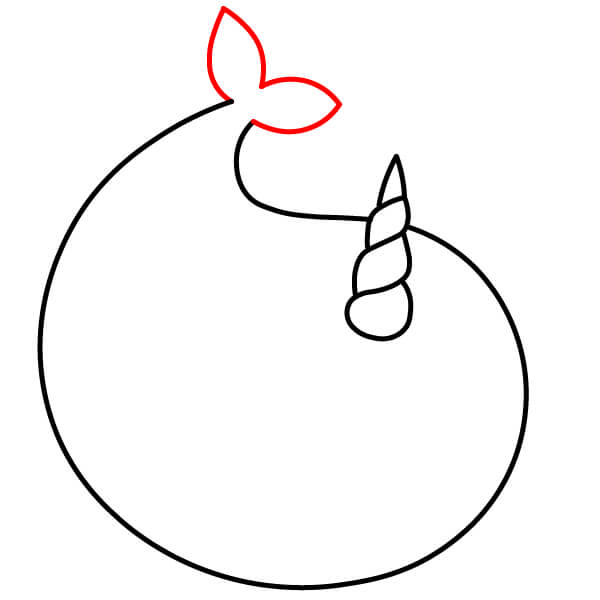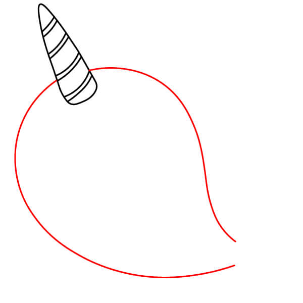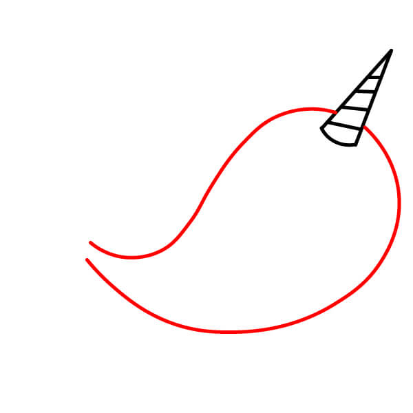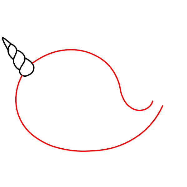 Tiếp theo, phác thảo đầu và thân của narwhal, bắt đầu từ gốc chiếc sừng và tạo thành một hình tròn, kéo dài xuống dưới rồi uốn cong để gợi phần đầu của đuôi.