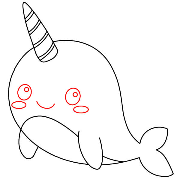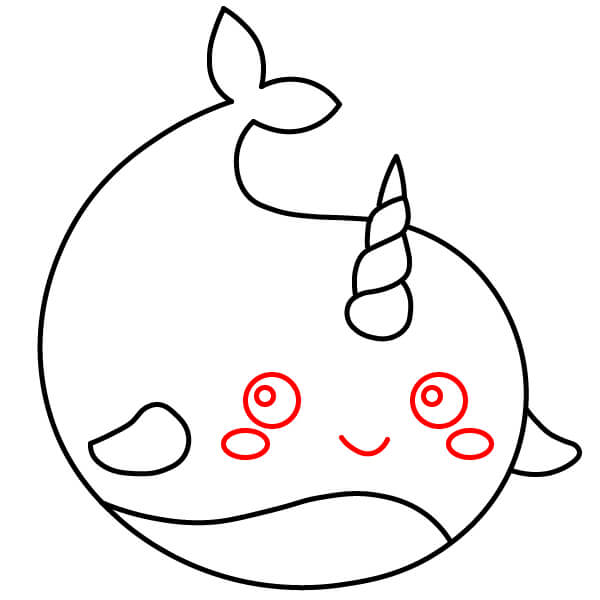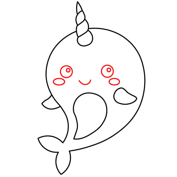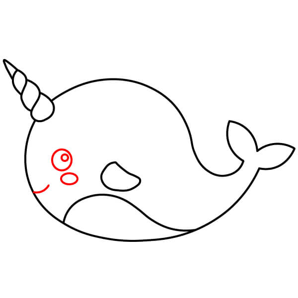 Đến lúc làm cho narwhal có “tính cách” rồi! Vẽ một con mắt tròn, bên trong có vòng tròn nhỏ làm con ngươi. Thêm một nụ cười cong nhỏ bên dưới mắt và các đốm má.