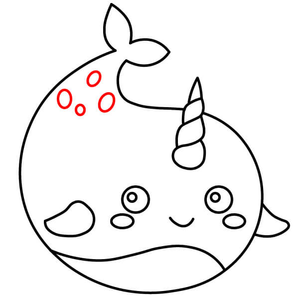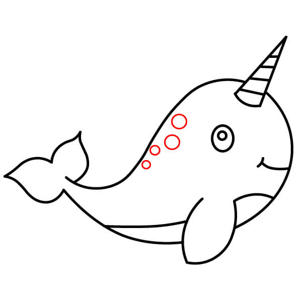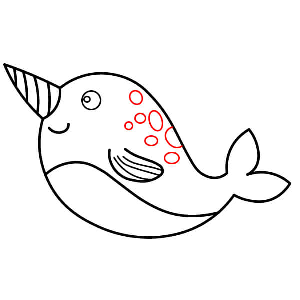 Thêm các đốm trên lưng và gần phần đuôi của narwhal. Chúng được vẽ dưới dạng các hình tròn và hình bầu dục nhỏ.