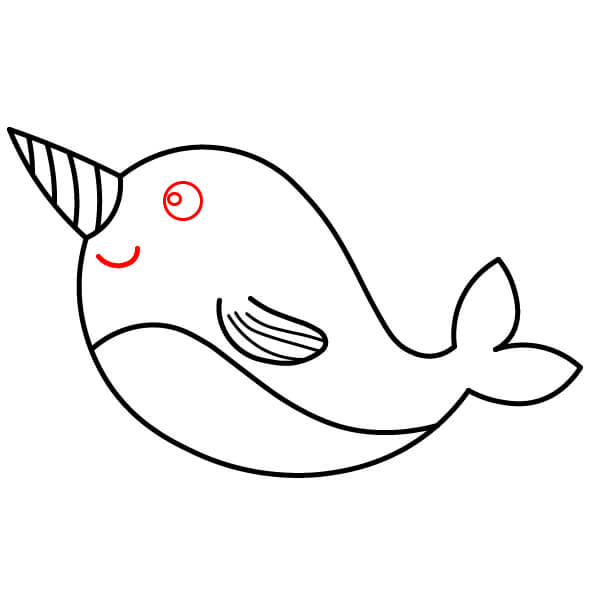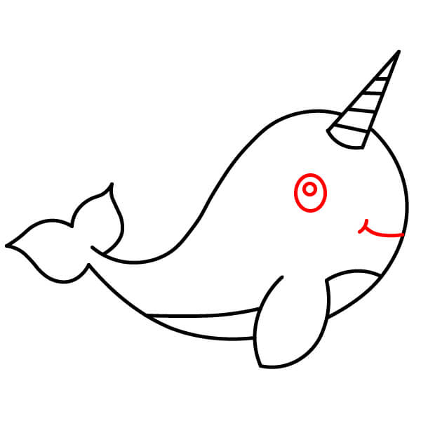Giờ hãy thêm khuôn mặt cho narwhal! Vẽ một con mắt tròn với vòng tròn nhỏ bên trong làm con ngươi. Bên dưới mắt, vẽ một nụ cười cong nhẹ dễ thương.