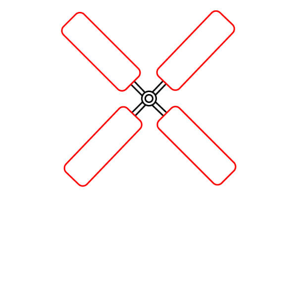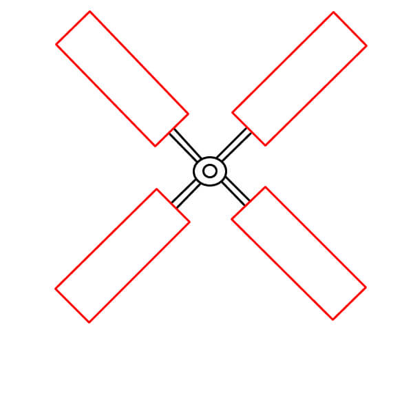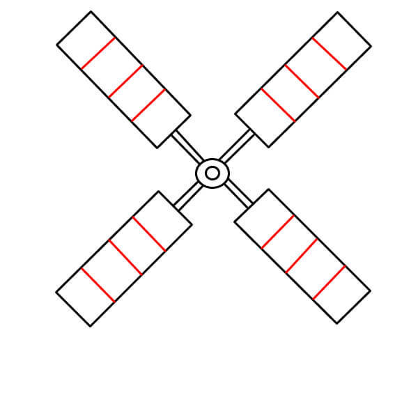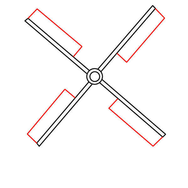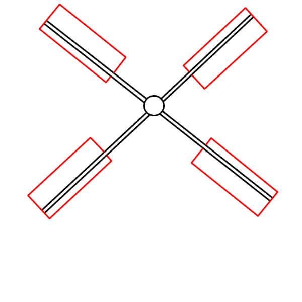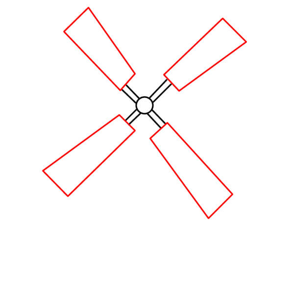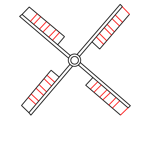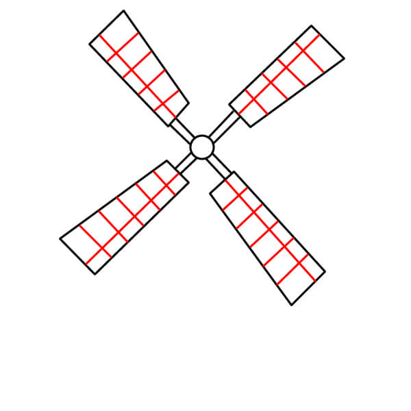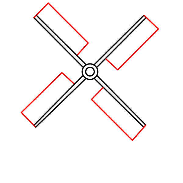 Vẽ bốn hình chữ nhật dài, mỗi hình nối với các đường thẳng đôi. Tạo thành 4 cánh cho cối xay gió.