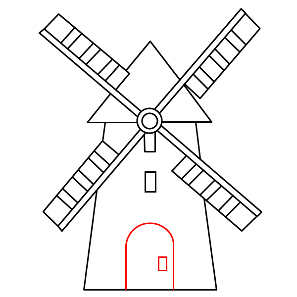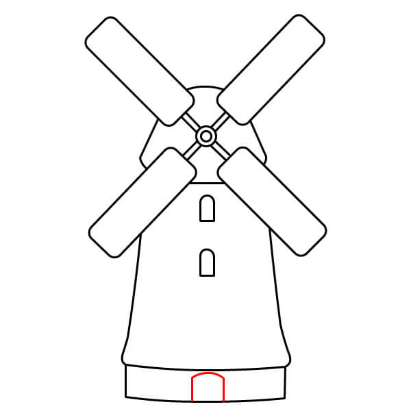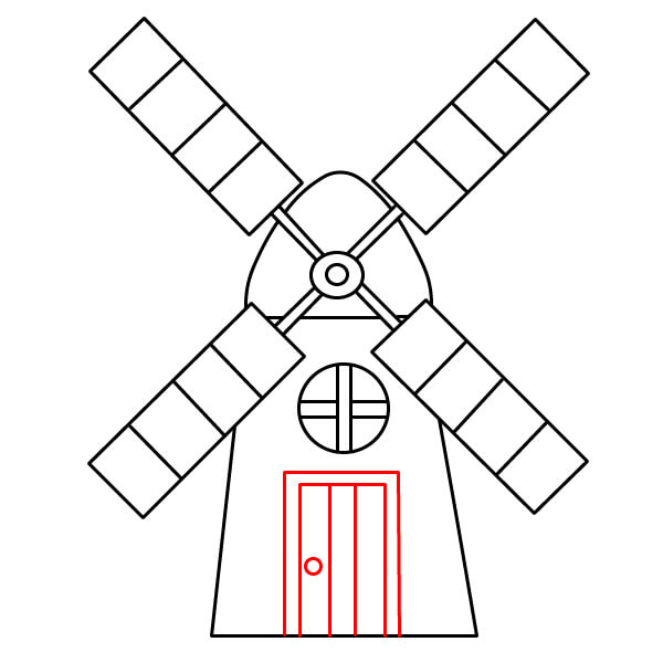 Vẽ một cánh cửa hình chữ nhật ở phía dưới cối xay gió, với các đường thẳng bên trong và một vòng tròn nhỏ làm tay nắm cửa.