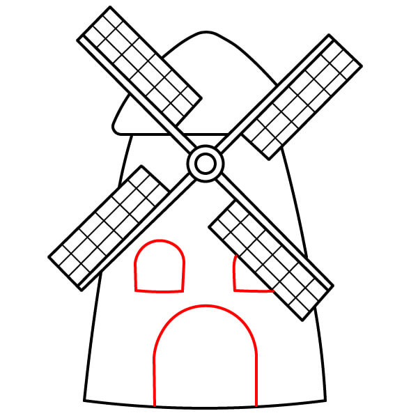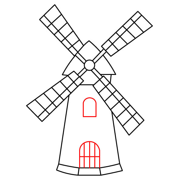 Vẽ hai hình chữ nhật cong trên thân cối xay gió, một hình chữ nhật chồng lên hình chữ nhật kia, để làm cửa sổ. Thêm một hình chữ nhật cong lớn hơn ở phía dưới để làm cửa ra vào, và vẽ họa tiết lưới bên trong.