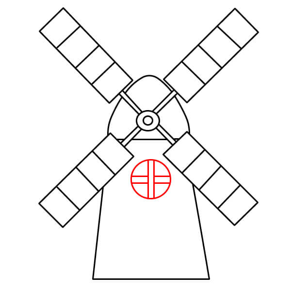 Thêm một cửa sổ tròn ở giữa thân xay gió. Vẽ một hình chữ thập bên trong cửa sổ.