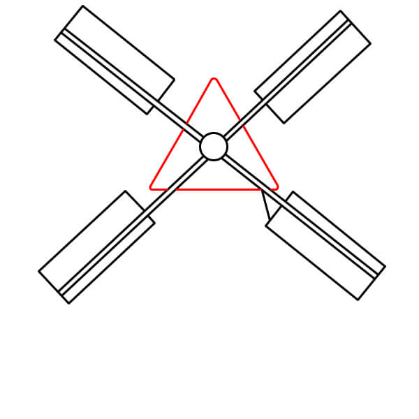 Vẽ một hình tam giác bắt đầu từ trục trung tâm và hướng lên trên, nằm giữa hai cánh tay của cối xay gió.
