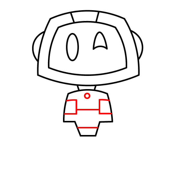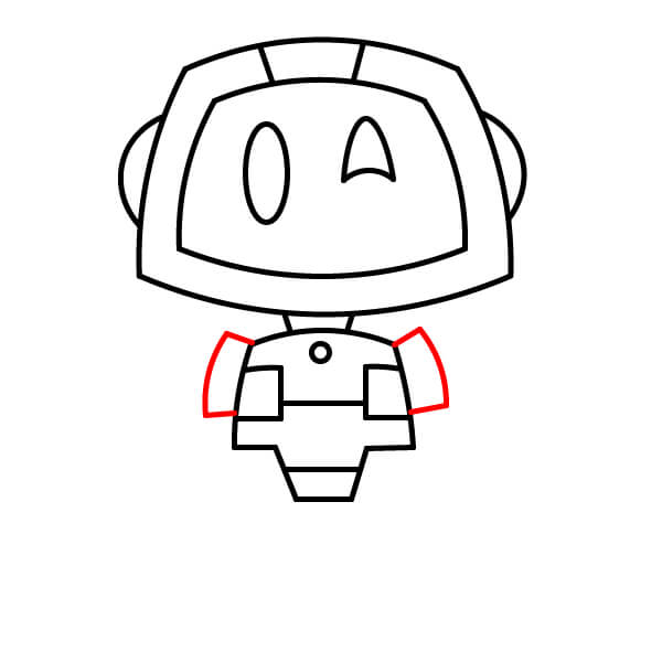 Ở hai bên phần thân trên, vẽ hai hình tròn hoặc hình học bo tròn nhỏ làm khớp vai, nơi cánh tay sẽ nối vào.