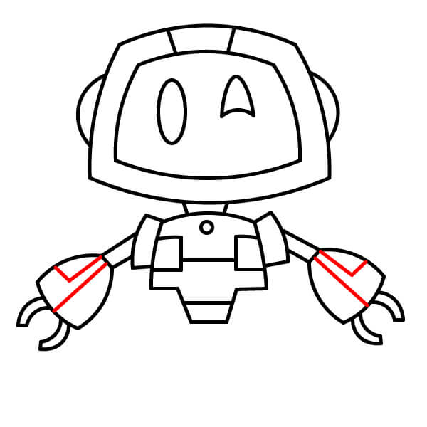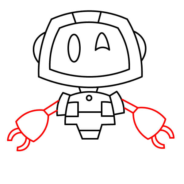 Vẽ các đoạn tay mảnh nối ra từ khớp vai. Ở cuối mỗi tay, vẽ bàn tay dạng càng kẹp lớn bo tròn với hai mũi nhọn cong ở phía dưới.