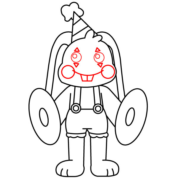 Vẽ hai hình tròn làm lòng trắng của mắt. Bên trong mỗi hình tròn, vẽ thêm một hình tròn nhỏ hơn làm con ngươi. Vẽ hai hình tam giác nhỏ phía trên mỗi mắt. Vẽ hai hình tròn lớn ở hai bên phần dưới của khuôn mặt làm má. Phác một đường cong rộng nối hai hình tròn má lại để tạo miệng, rồi vẽ hai chiếc răng cửa hình vuông bên dưới đường cong. Thêm một đường cong nhỏ phía trên miệng nối hai bên má.