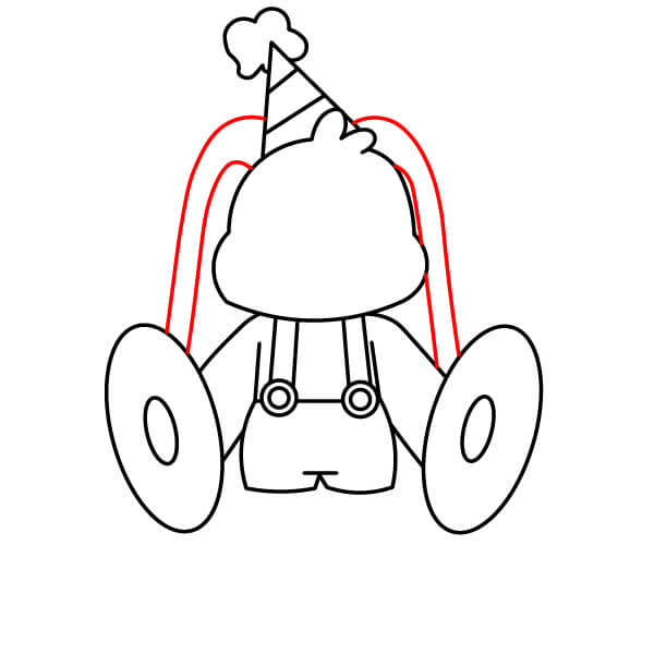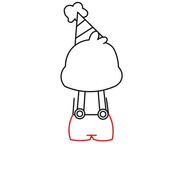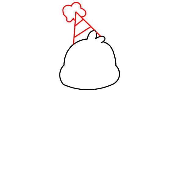 Vẽ một hình nón trên đỉnh đầu để làm mũ tiệc. Thêm vài đường chéo bên trong hình nón để tạo chi tiết. Ở chóp mũ, vẽ một hình giống đám mây nhỏ để làm quả bông trang trí.