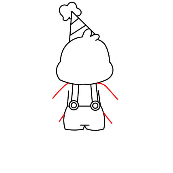 Vẽ hai đường ngắn hơi xiên ra ngoài từ hai bên của quần (vị trí thân) để bắt đầu tạo cánh tay. Đồng thời vẽ thêm hai đường xiên ngắn nối phần quần với phần thân phía trên đã vẽ ở bước 4.