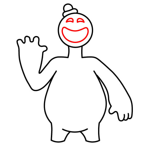 Vẽ một nụ cười lớn hình chữ U mở rộng chiếm gần nửa dưới của khuôn mặt. Phía trên miệng, vẽ hai đường cong nhỏ để thể hiện đôi mắt híp vui vẻ.