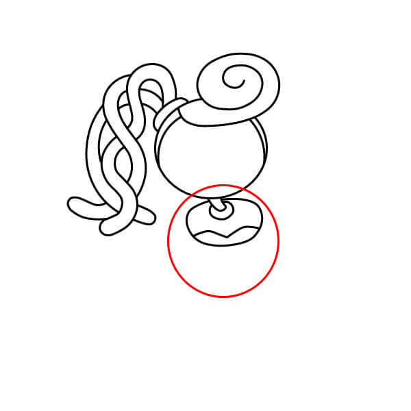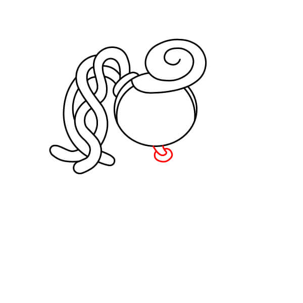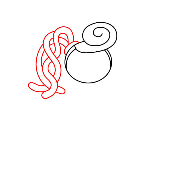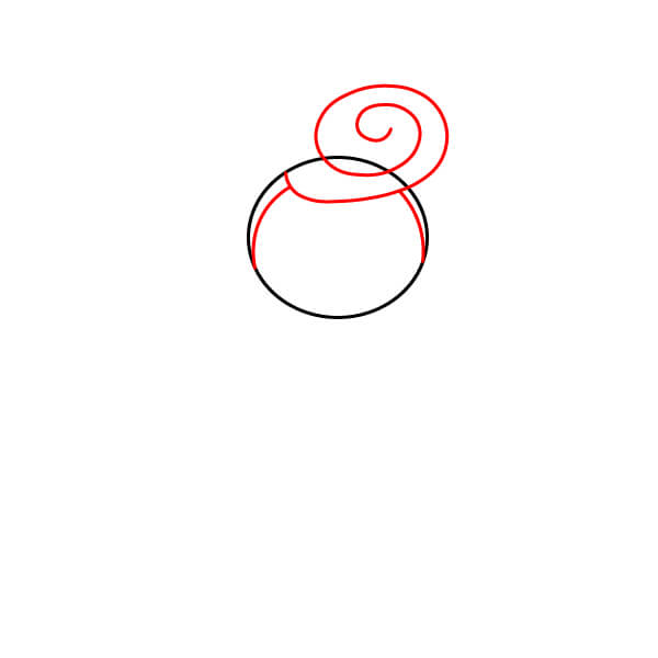 Vẽ một đường cong trên đỉnh hình tròn để tạo đường chân tóc, sau đó thêm một lọn tóc xoắn lớn ở phía trên bên phải để tạo búi tóc hoặc đuôi tóc cuộn.