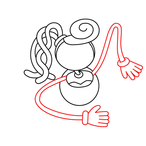 Vẽ hai cánh tay dài, mảnh giống ống kéo ra từ thân. Thêm bàn tay hình vuông có các ngón tay và một vòng cổ tay ở mỗi cổ tay.