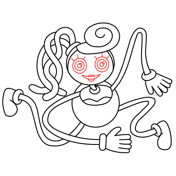 Bên trong đầu, vẽ hai hình tròn lớn làm mắt. Bên trong mỗi mắt, vẽ các hình tròn đồng tâm nhỏ hơn để tạo con ngươi và chi tiết quanh mắt, giúp đôi mắt trông to giống búp bê. Cuối cùng vẽ một chiếc miệng nhỏ đang cười với phần môi.