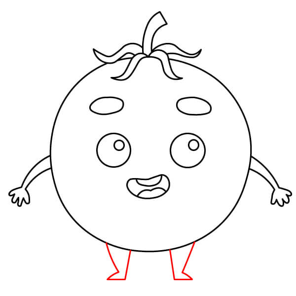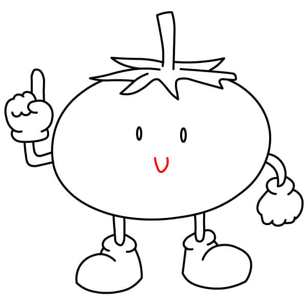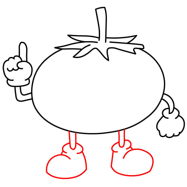 Tô màu đỏ cho quả cà chua, màu xanh lá cây cho cuống và đài hoa, và màu vàng cho tay, chân và giày.
