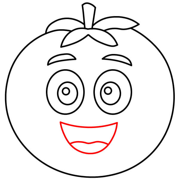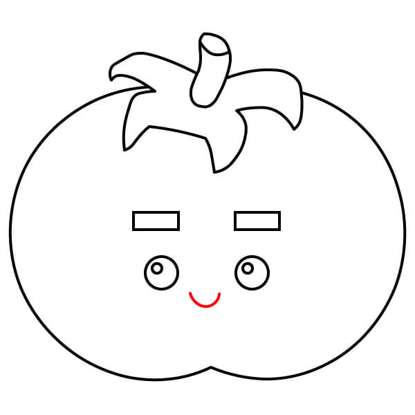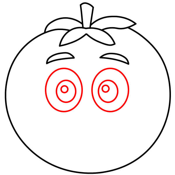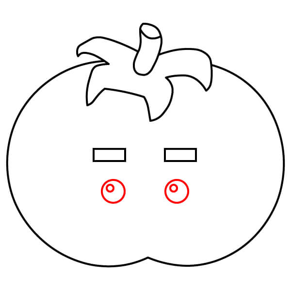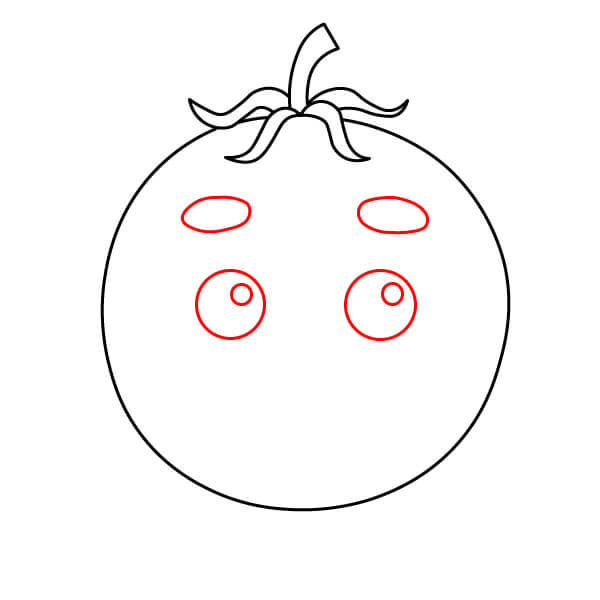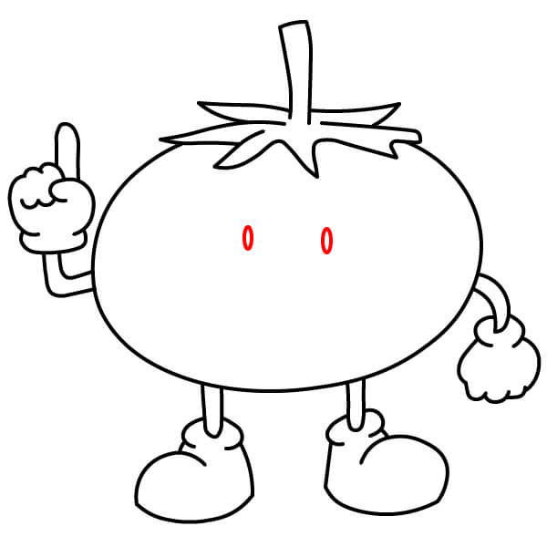 Tô màu đỏ cho quả cà chua, màu xanh lá cây cho cuống và đài hoa, màu đen cho lông mày, viền mắt màu đen với phần bên trong màu trắng.
