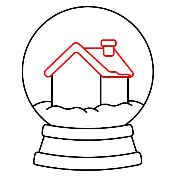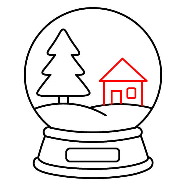 Bước 8: Vẽ một ngôi nhà đơn giản ở phía bên phải của quả cầu, phía sau đống tuyết. Ngôi nhà nên có tường thẳng, mái hình tam giác, một cửa ra vào và một cửa sổ.