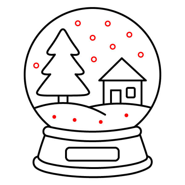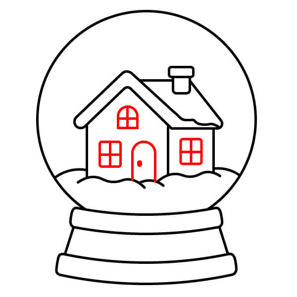 Bước 10: Tô màu phần bên trong quả cầu màu xanh nhạt, các bức tường chính của ngôi nhà màu vàng hoặc nâu nhạt, mái nhà màu đỏ và ống khói màu đỏ, để tuyết trên mái nhà màu trắng. Tô màu cửa màu nâu, các ô cửa sổ màu vàng nhạt hoặc trắng, đống tuyết màu trắng, phần đế màu sắc tươi vui, chẳng hạn như màu xanh lá cây, với viền/các cạnh màu tương phản như xanh lá cây đậm hơn hoặc đen.