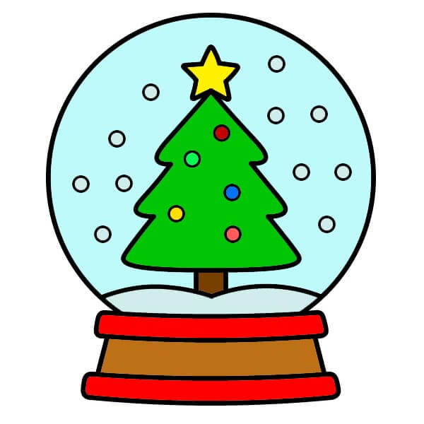 Bước 11: Tô màu thân chính của cây thông Noel màu xanh lá cây tươi sáng, thân cây màu nâu và ngôi sao trên đỉnh cây màu vàng. Tô màu các hình tròn nhỏ trang trí trên cây bằng nhiều màu sắc tươi sáng khác nhau (ví dụ: đỏ, xanh dương, vàng, xanh lá cây). Tô màu khoảng trống bên trong quả cầu màu xanh nhạt để gợi lên bầu trời hoặc không khí mùa đông, ụ tuyết ở dưới đáy quả địa cầu màu trắng hoặc xám/xanh nhạt để tạo bóng. Để nguyên màu trắng cho những bông tuyết rải rác. Tô màu nâu cho phần đế và màu đỏ cho các vòng trang trí/viền của đế.