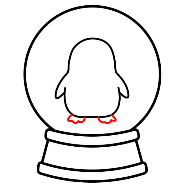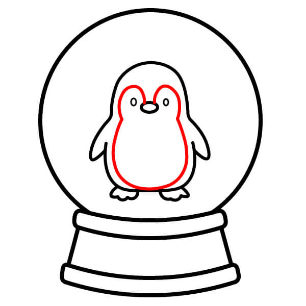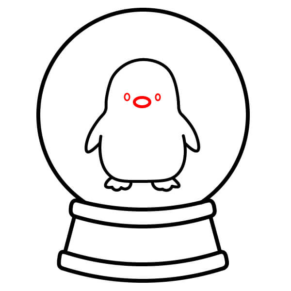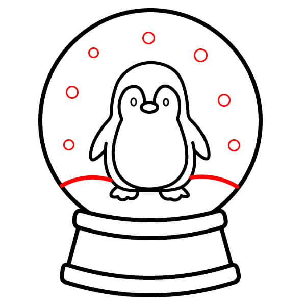 Bước 8: Vẽ một đường lượn sóng ở đáy quả cầu, ngay bên dưới chân chim cánh cụt, để tượng trưng cho một ụ tuyết. Vẽ một vài vòng tròn nhỏ rải rác xung quanh khoảng trống bên trong quả cầu để tượng trưng cho những bông tuyết rơi.