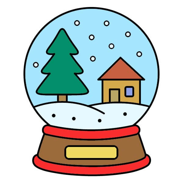 Bước 10: Tô màu phần không gian bên trong quả cầu màu xanh nhạt, cây màu xanh lá cây đậm và thân cây màu nâu. Tô màu tường nhà màu vàng nhạt/vàng nhạt và mái nhà màu nâu đỏ, cửa ra vào màu nâu và cửa sổ màu xanh nhạt/tím. Tô màu đống tuyết màu trắng. Để nguyên màu trắng cho những bông tuyết rải rác. Tô màu phần thân chính của đế màu nâu, vòng trên và vòng dưới màu đỏ. Tô màu tấm bảng nhỏ màu vàng hoặc vàng kim.