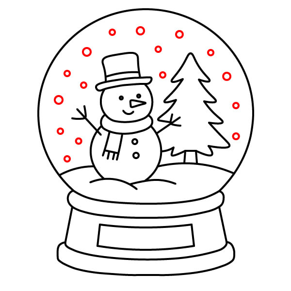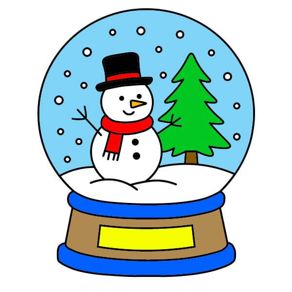 Bước 10: Tô màu thân người tuyết màu trắng, mũ màu đen, khăn quàng cổ màu đỏ, mũi màu cam/vàng, và cúc áo cùng mắt màu đen. Tô màu cây màu xanh lá cây và thân cây màu nâu. Tô màu phần không gian bên trong quả cầu màu xanh nhạt và ụ tuyết màu trắng. Để nguyên màu trắng cho những bông tuyết rải rác. Tô màu phần chính của đế màu nâu, vòng trên và vòng dưới màu xanh đậm. Tô màu tấm bảng màu vàng nhạt hoặc vàng kim.