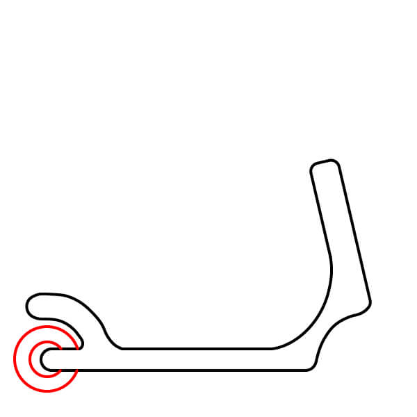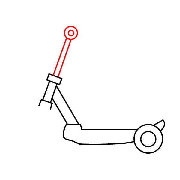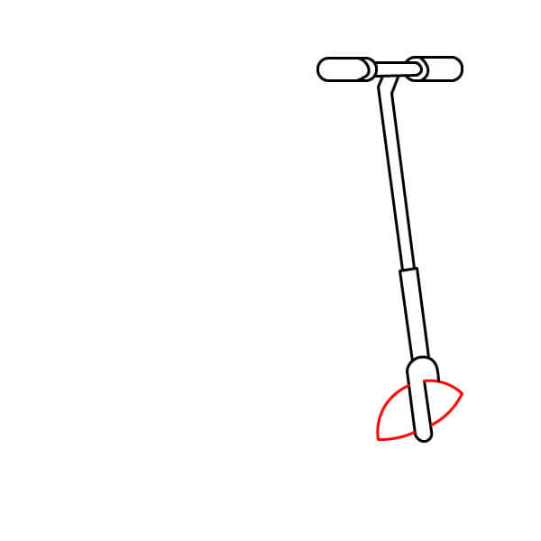 Bước 4: Thêm giá đỡ bánh trước. Ở phía bên trái của cột lái chính, vẽ hai đường cong ngắn trông giống như một cặp dấu ngoặc đơn, kéo dài xuống dưới và hơi ra ngoài.
