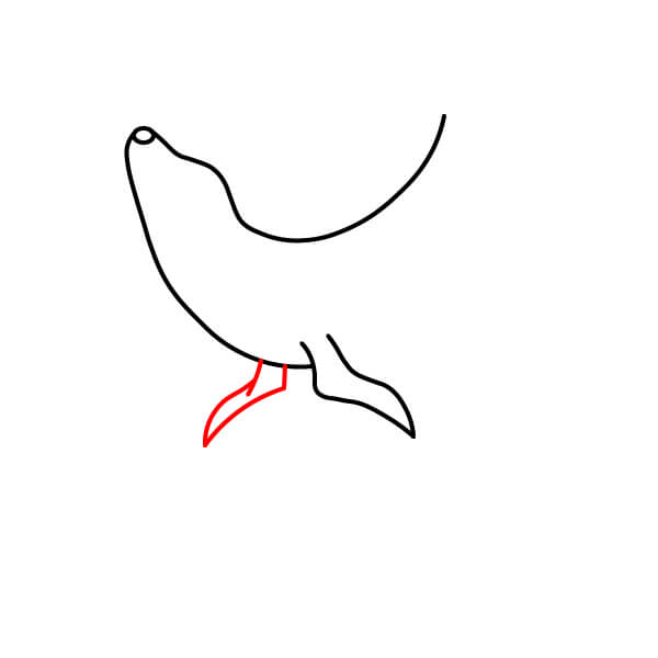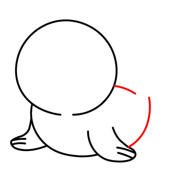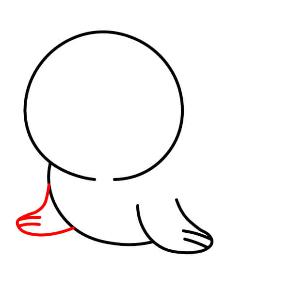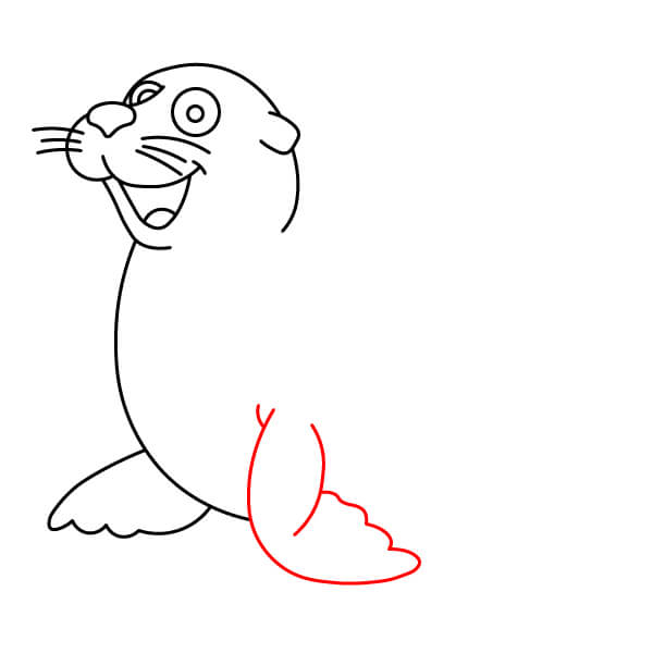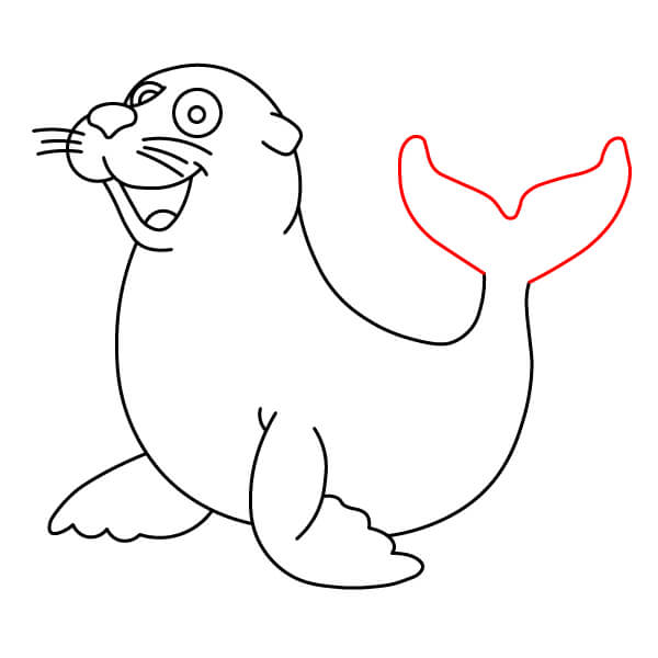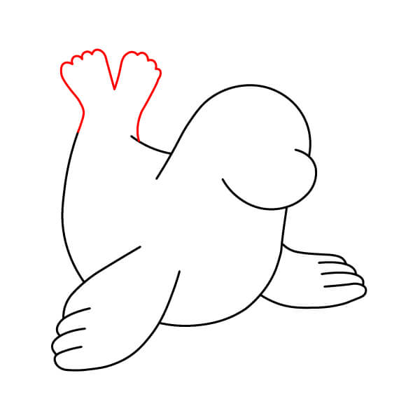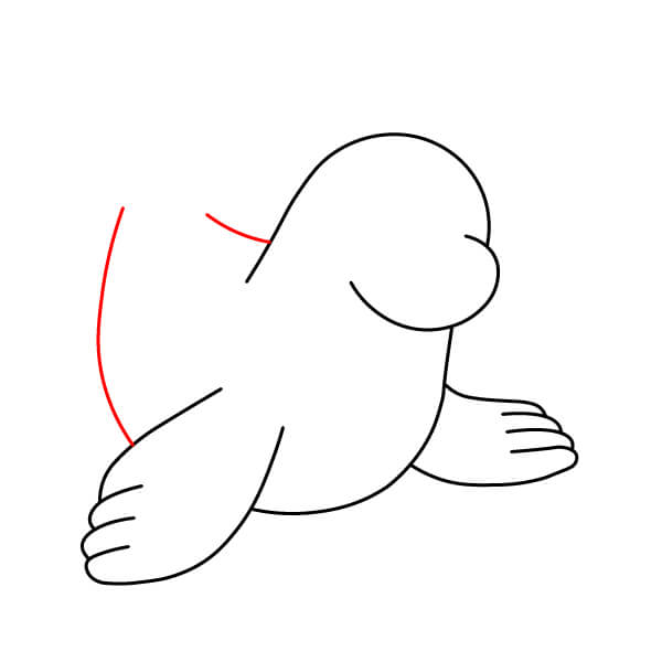Vẽ vây sau (đuôi). Vây này được vẽ gập lại bên dưới cơ thể, hướng ra ngoài, thể hiện hình dạng tròn với một vài vết lõm nhỏ giống như ngón chân. Vẽ đường nối phần thân dưới với hai chân chèo.