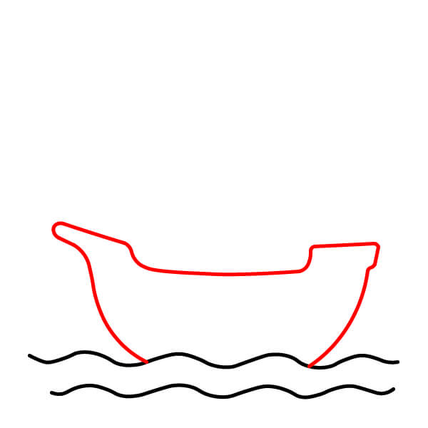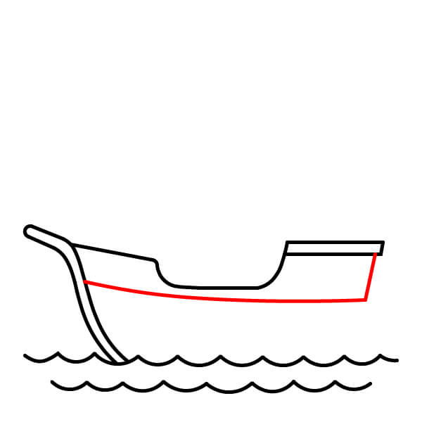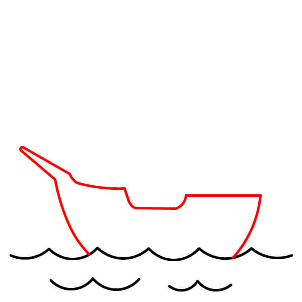 Phía trên các con sóng, vẽ đường viền chính của thân tàu. Hình dạng này nên tròn ở phần đáy và kéo dài lên trên, với mũi tàu (phía trước) hơi nhọn và đuôi tàu (phía sau) thẳng đứng, gần như vuông. Thân tàu nên nằm chìm một phần trong các con sóng.