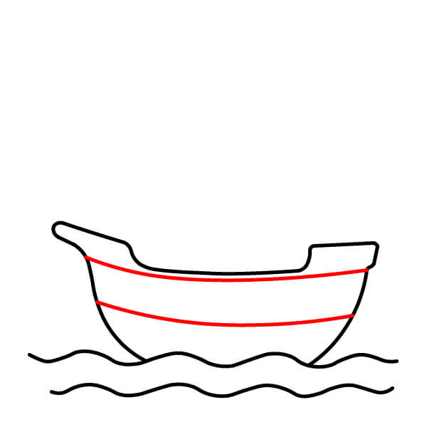 Vẽ hai đường ngang chạy quanh phần giữa thân tàu. Những đường này thể hiện lan can boong tàu và các chi tiết ván gỗ của con tàu.