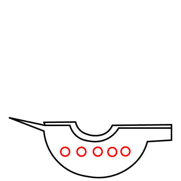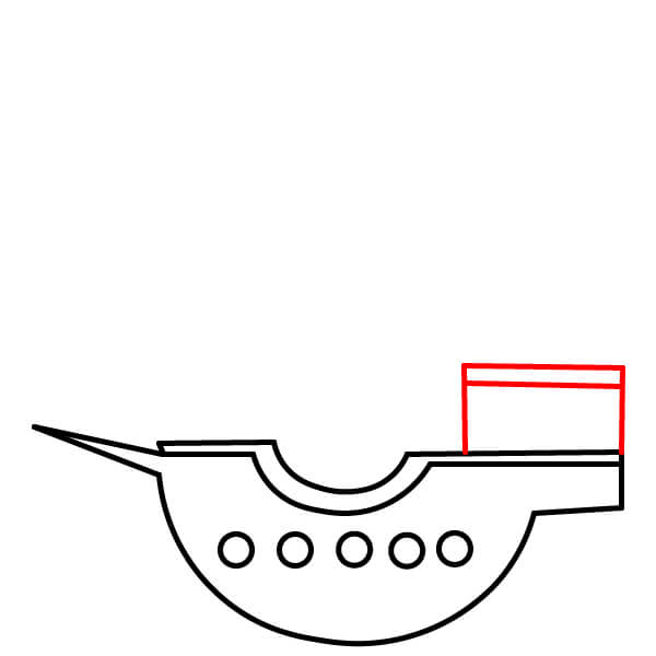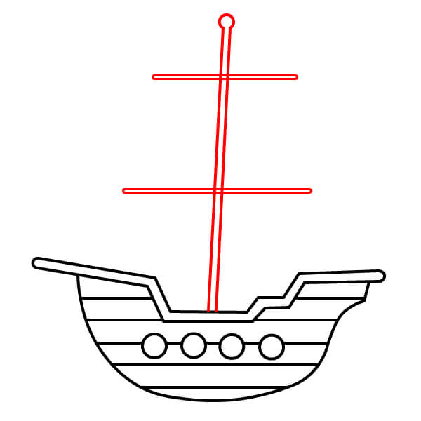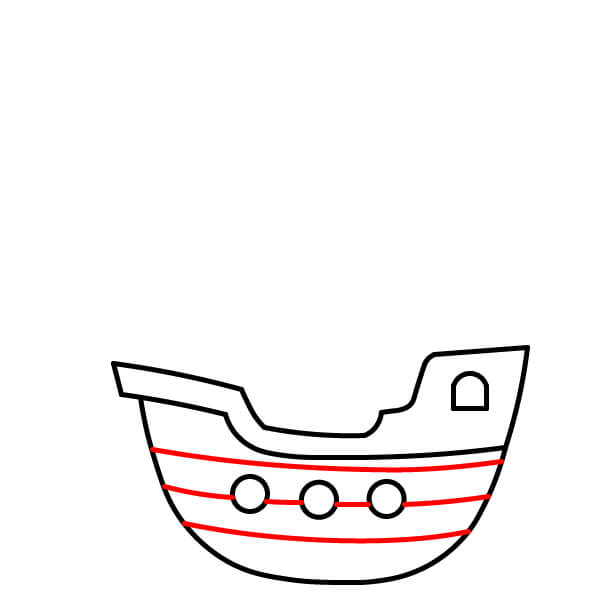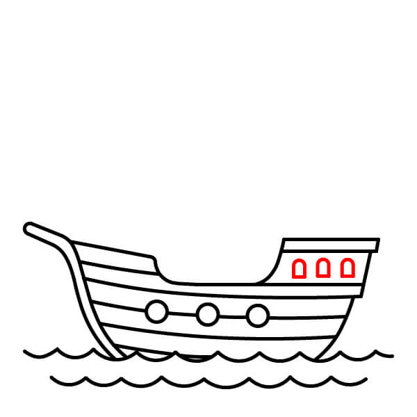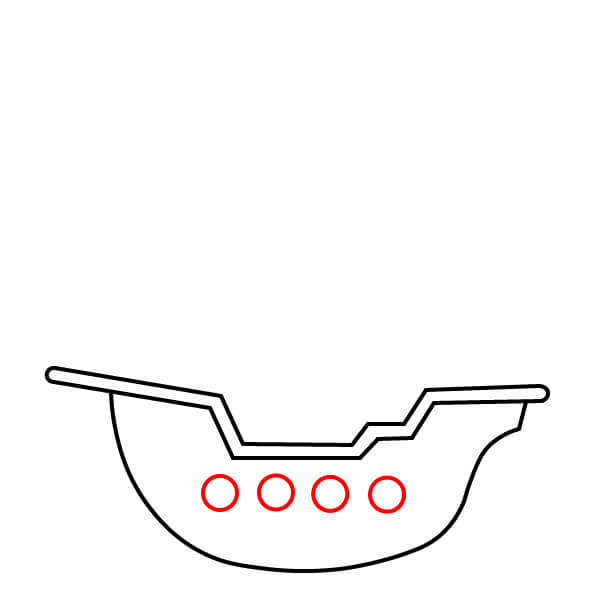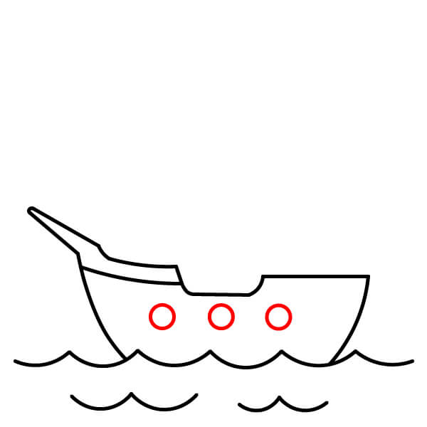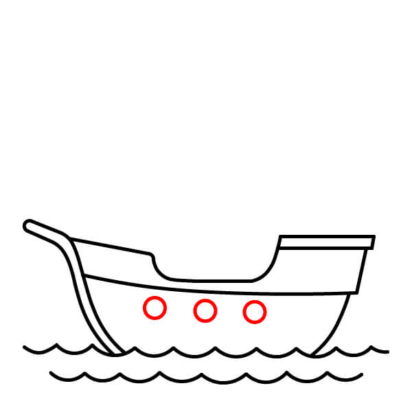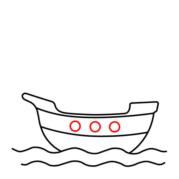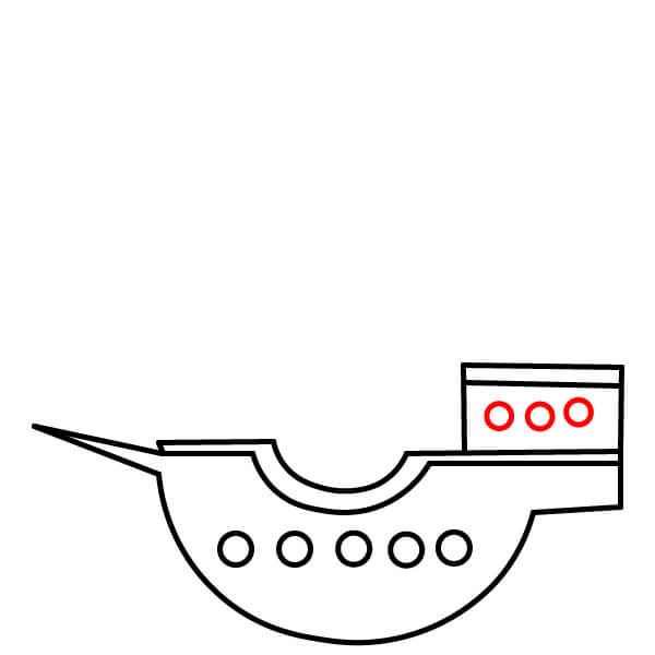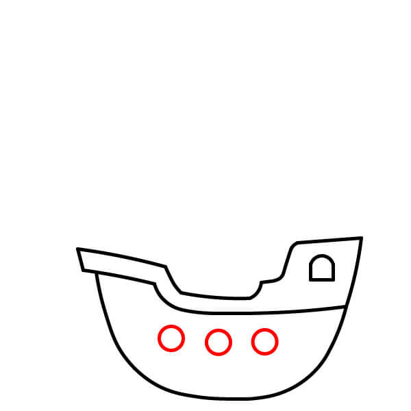 Vẽ năm hình tròn nhỏ xếp thành một hàng dọc theo phần cong phía dưới của thân tàu. Đây là các cửa sổ tròn hoặc lỗ đặt đại bác.
