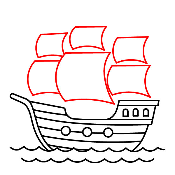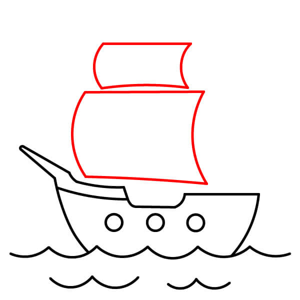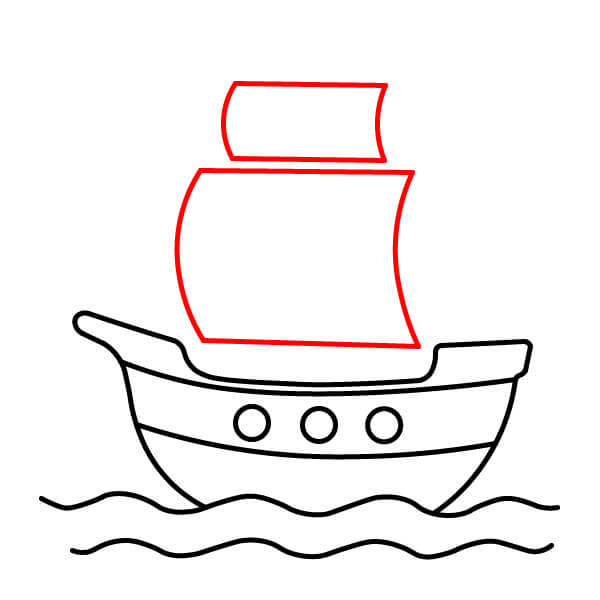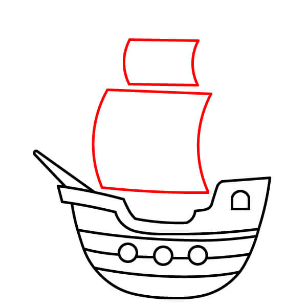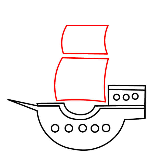 Vẽ hai cánh buồm lớn. Đây là những hình chữ nhật hơi cong đặt cao phía trên thân tàu. Buồm dưới lớn nhất, còn buồm phía trên nhỏ hơn một chút.
