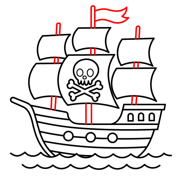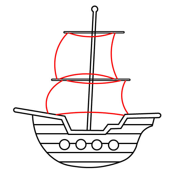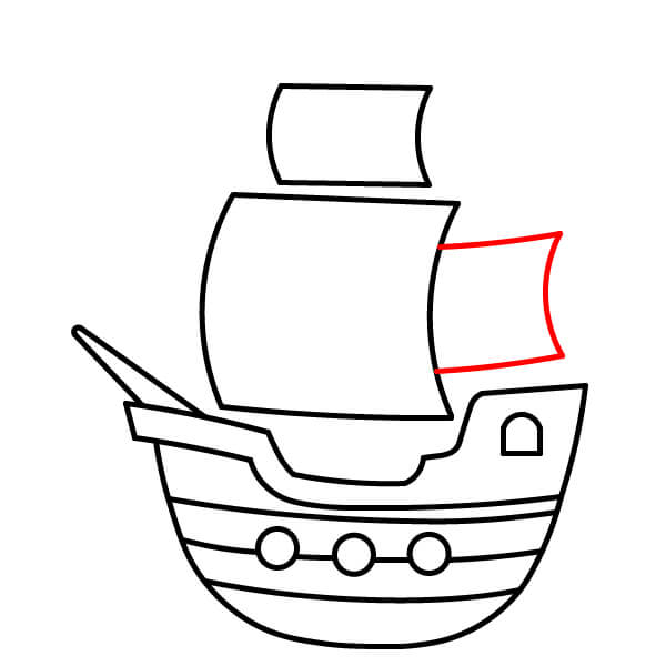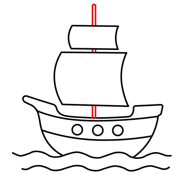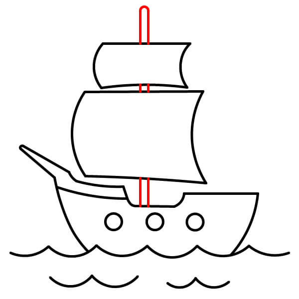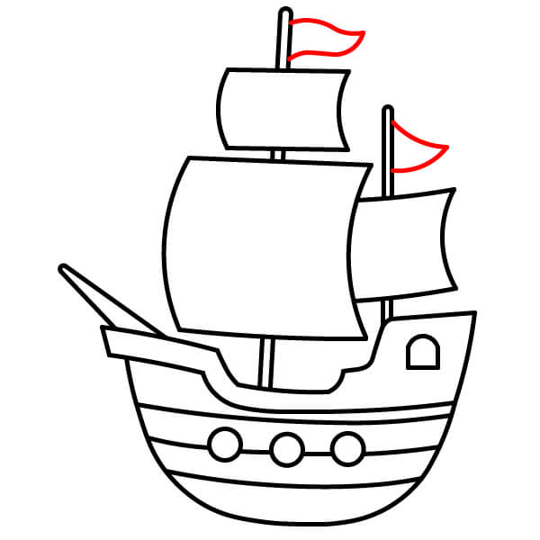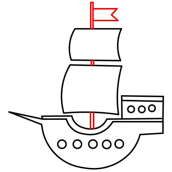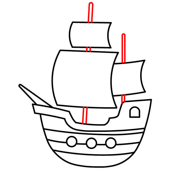Vẽ hai cột buồm thẳng đứng xuyên qua các cánh buồm và nối xuống boong tàu. Thêm các thanh ngang để đỡ buồm và vẽ một cột cờ với lá cờ đỏ ở đỉnh cột buồm cao hơn.