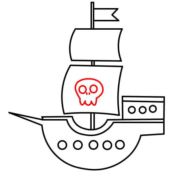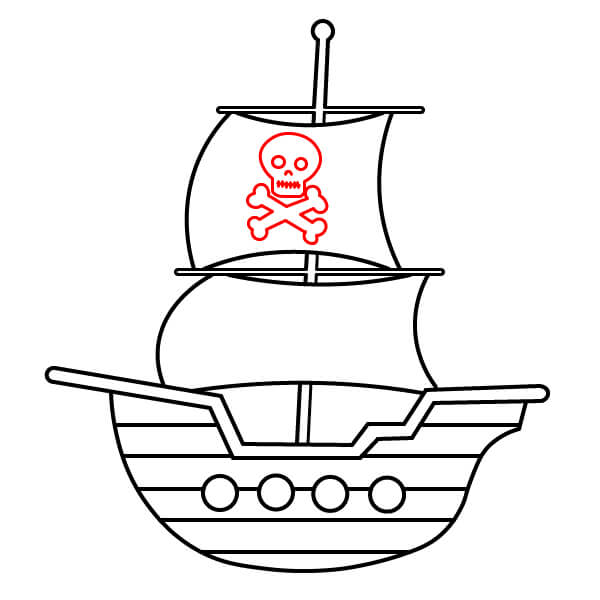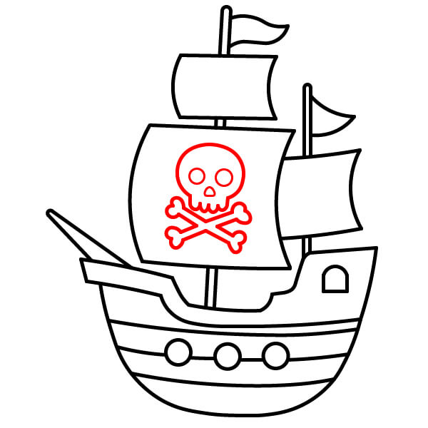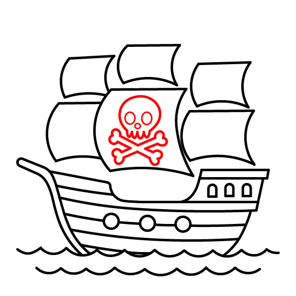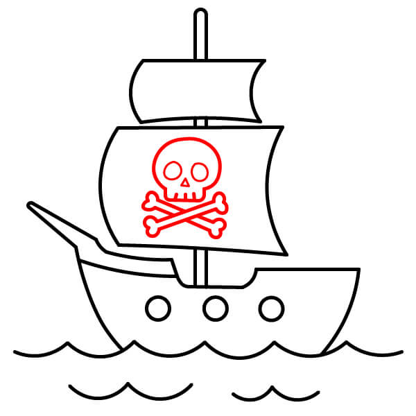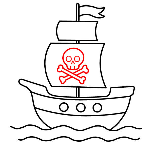 Trên cánh buồm lớn nhất, vẽ biểu tượng đầu lâu và hai xương chéo (Jolly Roger). Bắt đầu bằng đường viền đầu lâu, sau đó vẽ hai chiếc xương bắt chéo phía dưới.
