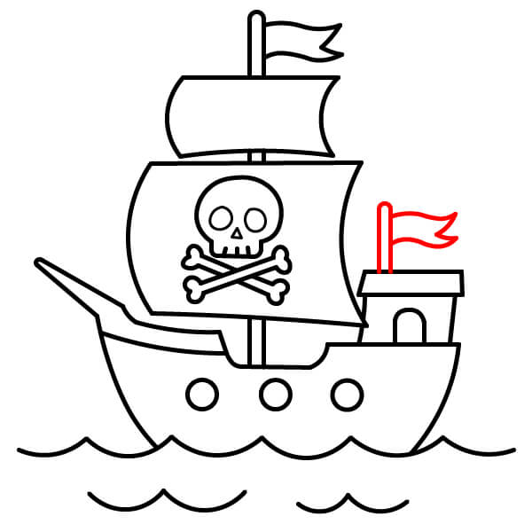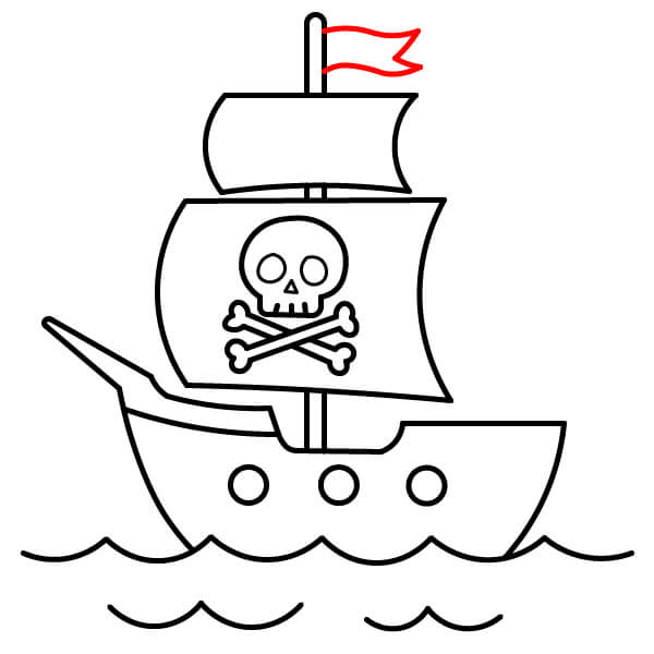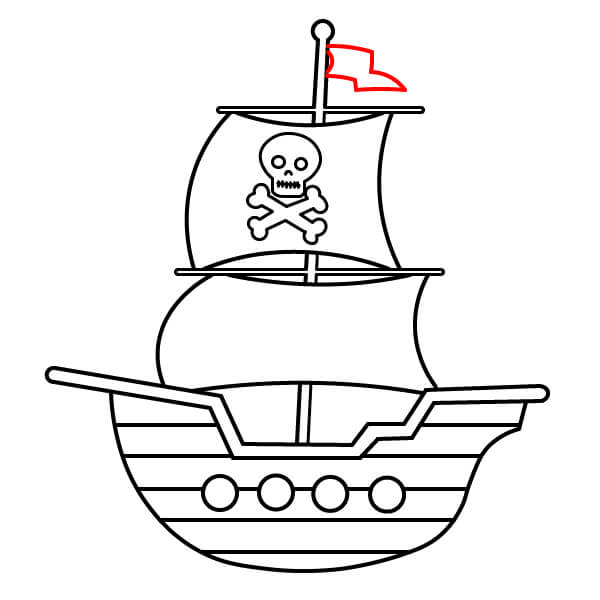 Vẽ các lá cờ nhỏ hình tam giác ở đỉnh của cả hai cột buồm. Như vậy là bạn đã hoàn thành hình con tàu cướp biển hoạt hình.