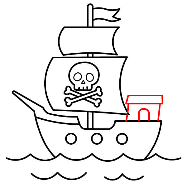 Ở phần đuôi tàu, vẽ một cabin nhỏ hình chữ nhật. Cabin này có một vòm cong tượng trưng cho cửa ra vào hoặc cửa sổ, và mái bằng.