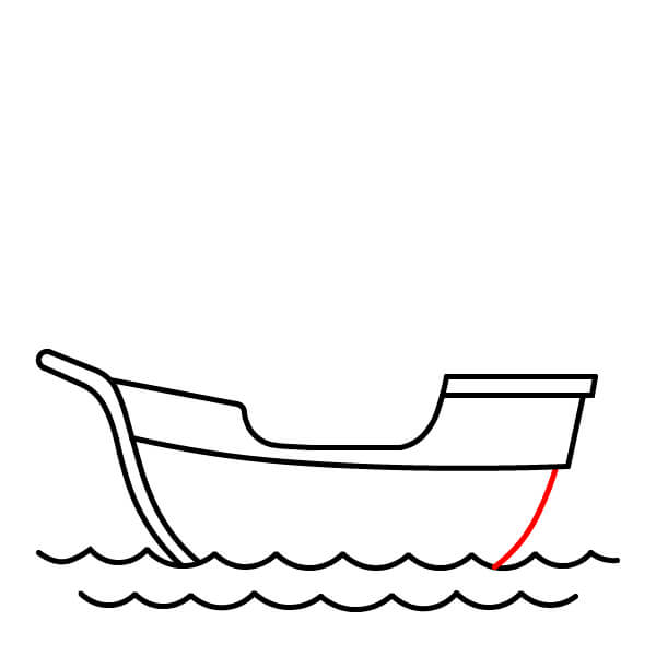 Vẽ một đường cong thẳng đứng ở phía đuôi tàu để nối phần sau của thân tàu với mặt nước, hoàn thiện hình dạng chính của con tàu.
